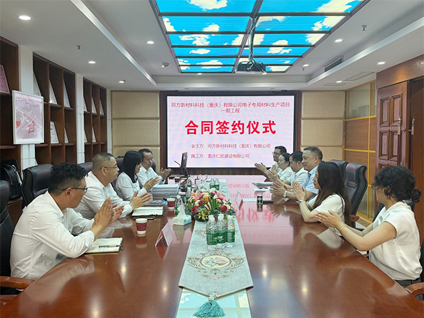 2025年6月9日上午,同方新型材料科技(重庆)有限公司与重庆仁旺建设有限公司于动力时光办公楼签署《电子专用材料生产项目(一期)工程施工总承包合同》。 由重庆仁旺建设有限公司董事长刘人旺先生致欢迎辞,强调本项目对重庆电子信息产业链升级的战略意义,期待与同方新型材料科技(重庆)有限